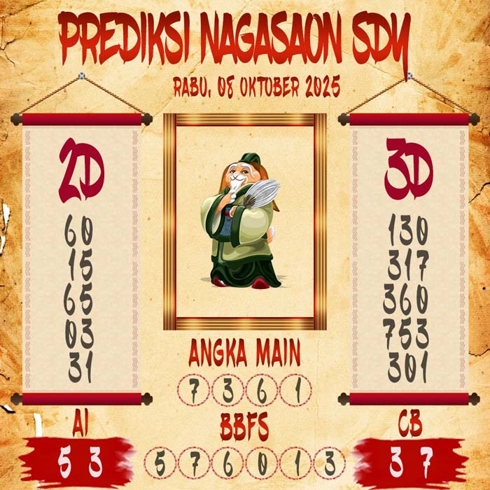 Untuk Mendapatkan bocoran bandar sydney hari ini ataupun live draw sd kitanya kita perlu menampilkan prediksi angka main sdy untuk menebak live draw sydney yang di keluarkan dari live togel sdy dalam data sydney live. Seperti Tampilan diatas, prediksi sydney hari ini di prediksi oleh nagasaon sydney untuk para pecinta prediksi sidney hari ini.